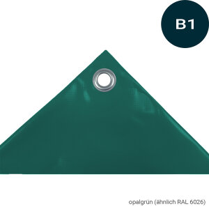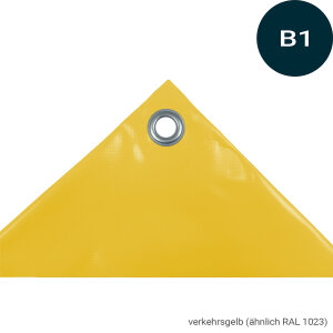 Diese sehr robuste und strapazierfähige Gewebeplane (Polyester-Gewebe) ist beidseitig mit PVC beschichtet und absolut wasserdicht. Das Flächengewicht von 650 g/m² bis 680 g/m² (je nach Farbe) entspricht der Qualität von LKW-Planen. In dem rundum verstärkten Saum sind in einem Standardabstand von ca. 50 cm verzinkte Rund-Stahlösen mit einem Innen-Ø von 12 mm angebracht. Die PVC Plane ist schwer entflammbar entsprechend DIN 4102 B1 und somit für den Einsatz in Innenräumen und/oder bei öffentlichen Veranstaltungen geeignet.