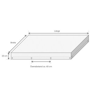 Da das Material luftdicht ist, sollte die Abdeckhaube regelmäßig entfernt und eventuell entstandenes Kondenswasser weggewischt werden, um einer möglichen Schimmelbildung vorzubeugen. Unsere Abdeckhauben werden standardmäßig an der Öffnung gesäumt und mit Ösen versehen, an denen die Abdeckhaube fixiert werden kann.
