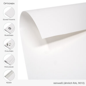 - Saum und Ovalösen mit Drehverschlüssen: in den verstärkten Rand (Saum) werden im Abstand von ca. 50 cm Ovalösen (Ø 22,5 mm x 13,5 mm Messing/vernickelt bzw. 42 mm x 22 mm Stahl/verzinkt) eingearbeitet. Die zugehörigen Drehverschlüsse für eine einfache Befestigung werden mitgeliefert.