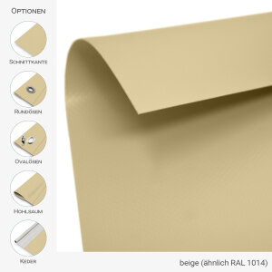 - Saum und Ovalösen mit Drehverschlüssen: in den verstärkten Rand (Saum) werden im Abstand von ca. 50 cm Ovalösen (Ø 22,5 mm x 13,5 mm Messing/vernickelt bzw. 42 mm x 22 mm Stahl/verzinkt) eingearbeitet. Die zugehörigen Drehverschlüsse für eine einfache Befestigung werden mitgeliefert.